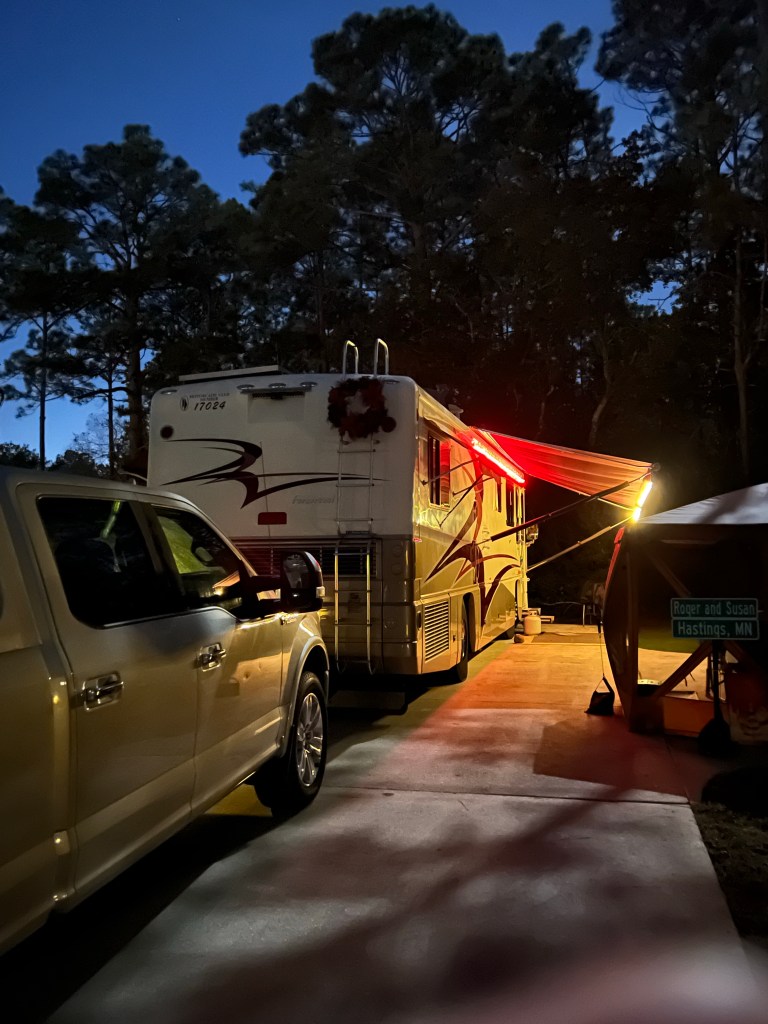 We arrived at the beginning of December, set up our shade room, hung the wreath, and the festive chili pepper lights, and plugged in the awning lights. We rearranged things on the patio after our first go at it. Mostly to get the door of the shade room under the edge of the big awning.