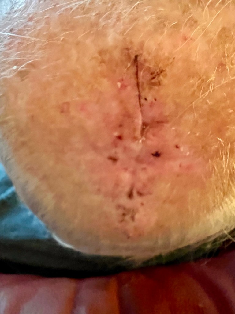 Between getting the driveway paved and our pickup fixed and all of our other summer projects, my dermatologist was concerned about a spot on my head, so she took a sample. They said it was squamous cell carcinoma and it needed to get removed with a Mohs procedure. So that got squeezed in. Removing a small 1/2” thing left quite a hole. When the football shaped excavation was all stitched up I felt like my ears were raised.