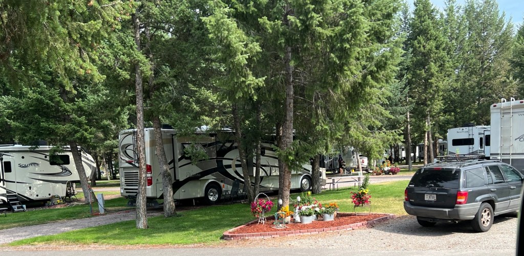 Then North along Flathead Lake to the west side of Glacier NP to Mountain Meadow RV Park, about 8 miles west of Glacier NP. We were looking for a spot in the park but sites to fit even our smaller 36 ft motorhome were limited. And our friend Klaus Peters was driving over to meet us for a couple of days so we stayed just outside of the park.