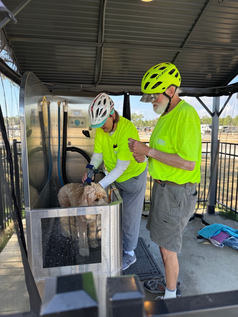 A new feature in the RV park this year is a dog wash station. It features water at the right temperature, shampoo, rinse, and blow dry. We had our own shampoo so we used the water and rinse features. The blow-dry function worked well but Maggie didn’t like it much.