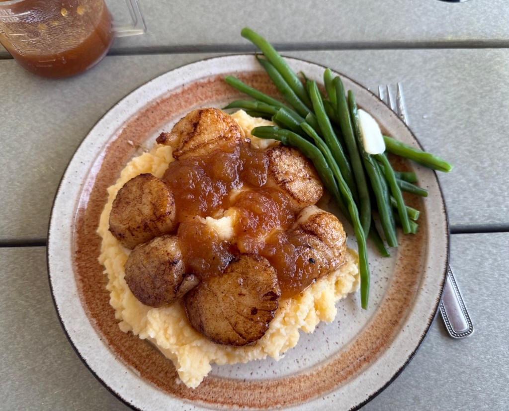 We also got sea scallops to have for a nice Valentines Day dinner. The scallops were pan seared and served on mashed potatoes with a roasted apple sauce with green beans. Very good.