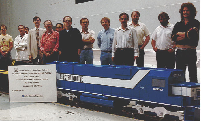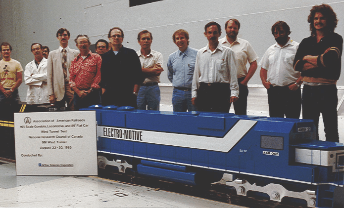 And there I was, third from the left in 1985. This was up in Ottowa, CA at the National Research Council of Canada’s 9M wind tunnel. We were all standing in the 30′ x 30′ cross section wind tunnel with a 1/6 scale model of a locomotive. We had several different locomotive types and many different rail cars as well. Another odd bit of history.